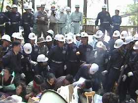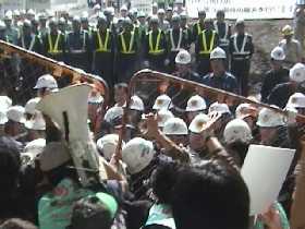 ●法律違反の強制排除午後になって、マスコミなどを通じて、情報が入ります。強制排除に踏み切るらしいとの事、緊張感がみなぎります。 12時半ごろ、ガードマンがフェンスをはずし始めます。しかもフェンスを押してきます。普通こういう場合自分たちのほうに引くのがやり方です。何が何でも挑発し、混乱させたがっているようです。 そもそも、都の代執行に、一方の当事者である処分組合が参加しているのがおかしなことです。しかも、処分組合の雇った警備会社「西東京セキュリティサービス」のガードマンが実行部隊です。代執行では、物件の移転は出来ても明渡しつまり人の排除は出来ないというのが常識です。そのうえガードマンは警備業法によって住民運動などに介入してはならないことになっているのです。二重三重の法律違反です。加えて、彼らガードマンはそのほとんどが二十歳そこそこのひょっとしたら未成年もいるような若い男たちでした。かっとなったら何をしでかすか解らない、そんな雰囲気を撒き散らして、私たちに向かってきたのです。 |