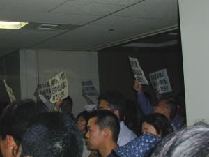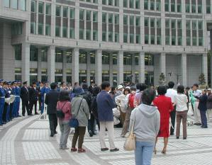 | ●庁舎入り口の封鎖 その後知事室へ向かい、いざ都庁に入ろうとして驚いた。なんと正面玄関がガードマンによって封鎖されているのだ。前代未聞である。これまでも収用委員会や知事室の前で、部屋にいれないとドアを閉められたことはあった。それも論外だったが今度は庁舎そのものに入れないというのだ。公共の建物に納税者である都民を入れない。まさに従わざるもの都民にあらず、という一昔前の発想ではないか。都知事の言う民主主義のルールとはこんなものなのか。全くあきれてしまった。 先日の記者会見で、石原都知事は民主主義のルールを破ったのは住民だとでたらめを言った。しかし曲がりなりにも民主主義といって住民を非難したわけだ。ならばこれはどういうことか。庁舎にも入れないというのが民主主義のルールとでも言うのだろうか。 |